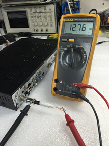 Should you believe your LNB is not receiving voltage from the DSR4639, you can test the output using the simple method demonstrated below. Be careful not to short out the decoder. Using a volt meter you should receive between 12 - 14V. If you have no LNB voltage send the receiver back for repair.